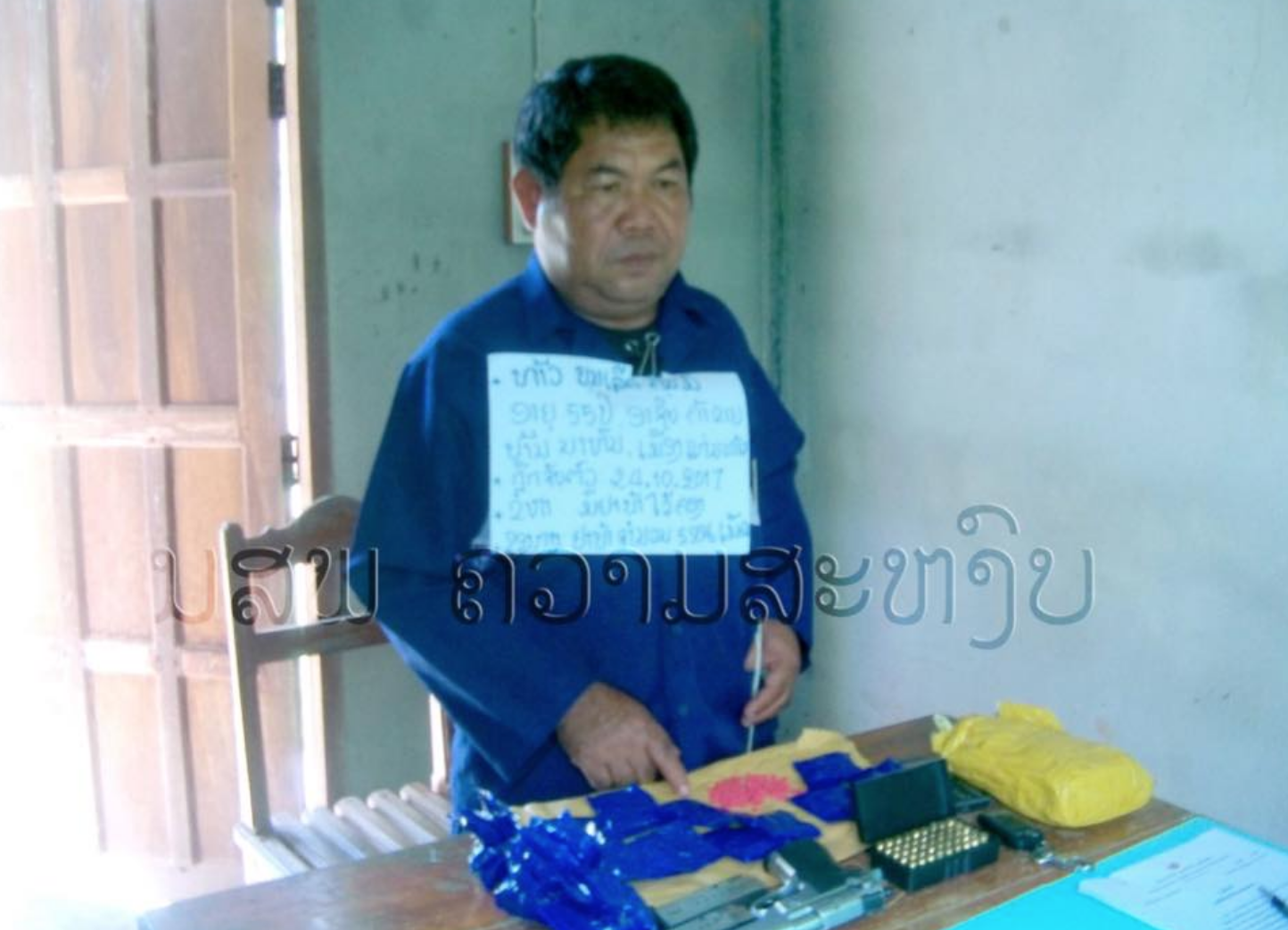 ໃນວັນທີ 24 ຕຸລາ 2017 ເຈົ້າໜ້າທີ່ຕໍາຫຼວດປະຈໍາດ່ານປະເພນີ ບ້ານນາແກ້ງມ້າ ເມືອງແກ່ນທ້າວ ແຂວງໄຊຍະບູລີ ໄດ້ກວດຄົ້ນລົດກະບະວີໂກ້ສີຂາວບໍ່ຕິດທະບຽນ ທີ່ກໍາລັງຜ່ານດ່ານກວດກາ ພົບເຫັນຢາບ້າ ຈໍານວນ 5.000 ກວ່າເມັດ ຊຸກເຊື່ອງໄວ້ຢູ່ໃນຕັບໂລ່ລົດ ພ້ອມອາວຸດປືນສັ້ນ ແລະ ລູກກະສຸນ. ຈາກນັ້ນ, ຈຶ່ງໄດ້ກັກຕົວຜູ້ຂັບຂີ່ ຊື່ທ້າວ ບຸນເລີດ ອາຍຸ 55 ປີ ຢູ່ບ້ານນາຫີນ ເມືອງແກ່ນທ້າວ ແຂວງໄຊຍະບູລີ ພ້ອມທັງເຂົ້າກວດຄົ້ນເຮືອນຜູ້ກ່ຽວ ພົບເຫັນລູກປືນອີກຈໍານວນ 14 ລູກ ແລະ ແກ໊ບໜາກຝ່າ 4 ດອກ.